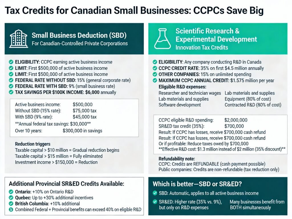 For Canadian-controlled private corporations (CCPCs), tax credits—not just deductions—can provide even more substantial savings. The Small Business Deduction (SBD) reduces federal tax from 15% to 9% on the first $500,000 of active business income, saving $30,000 annually. The Scientific Research & Experimental Development (SR&ED) program provides up to 35% tax credits on R&D spending, effectively reducing innovation costs by over one-third.